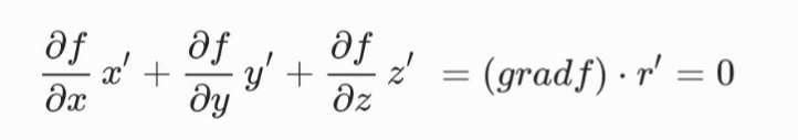 미분가능한 스칼라 함수 $f(x,y,z)=c$로 표현된 곡선에 대하여 그 위의 r($t$) = [$x(t), ~y(t),~z(t)$]로 표현됩니다. 점 P에서의 접선벡터들은 접평면을 이루고, 이 접평면에 수직인 벡터는 $grad~f$입니다.